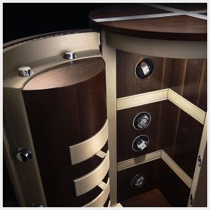 For decades, HARTMANN TRESORE has been one of the leading safe suppliers in Europe and the Middle East. Its comprehensive product portfolio ranges from all types of safes for private and business use to strongroom doors and entire strongrooms. However, the Signature Safes by HARTMANN TRESORE are a truly perfect combination of security and beauty. All safes in this series are unique items built in accordance with the customerâs special requirements; mainly watch safes and jewellery safes for discerning customers whose love of individuality and personal style also extends to matters of security. âMasterpiecesâ are the high point of the this premium Edition range; elegant safes that emphatically express the ownerâs individuality and particular taste. Perhaps you already have some ideas for your own private masterpiece? We will be glad to discuss them with you. But first let yourself be inspired by some of the safes we have already designed and built for our customers. The safe âEgoisteâ is an outstanding example. The work of fashion designer MiklĂłs Schiffer, this oval safe was created with a combination of exquisite wenge wood and cream-coloured, hand-stitched leather. It offers numerous shelves, drawers and watch winders â thus providing ample space not only for valuable watches and jewellery, but also for other valuables and special mementoes. âEgoisteâ could easily serve as an inspiration and model for your own safe â and private masterpiece.